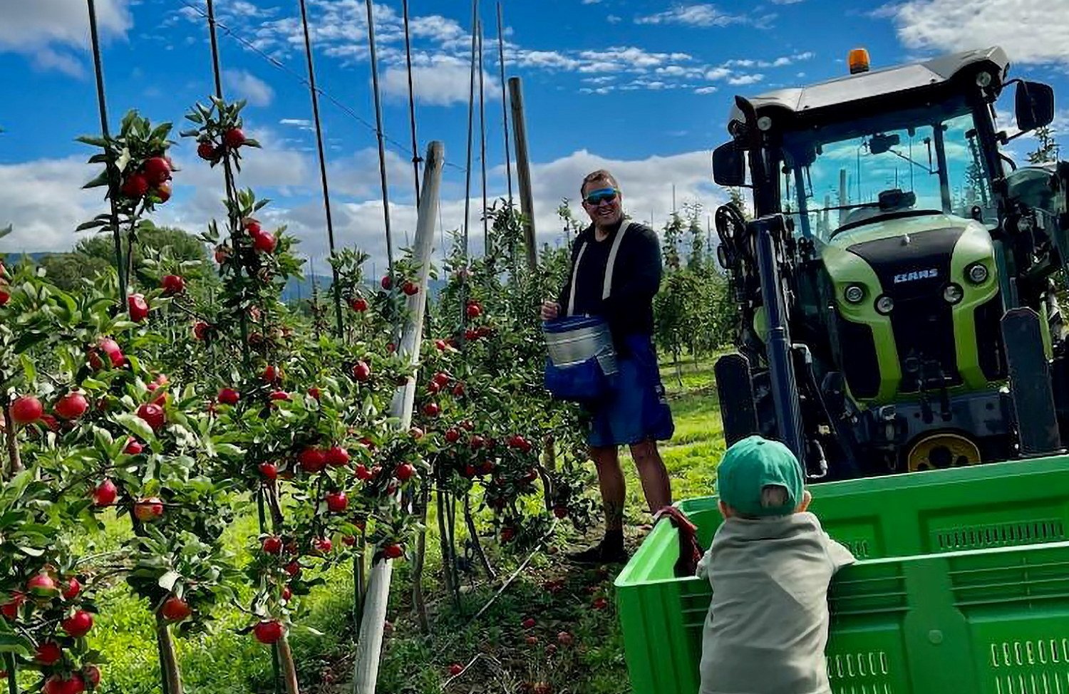 (Bilde: Even Skårberg Aarnes med neste generasjon eplebonde under sesongens innhøsting (Foto: Privat))