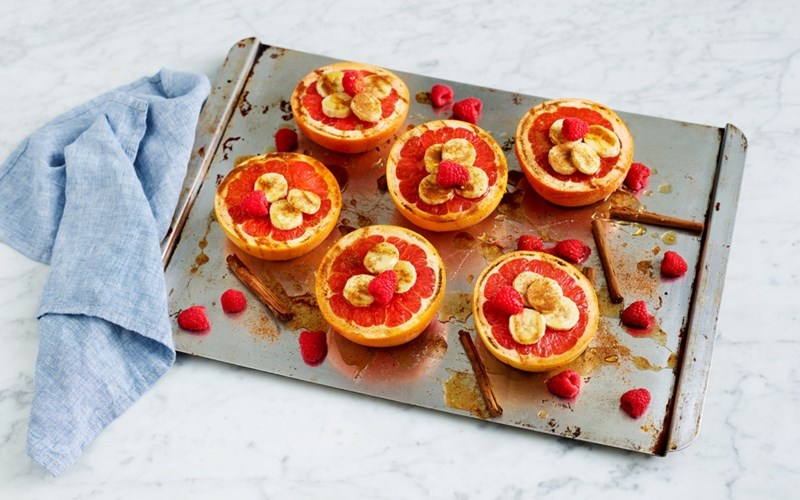 Bakt grapefrukt blir aromatisk og saftig! Prøv denne enkle desserten som toppes med bananskiver og bringebær. Se oppskriften her.