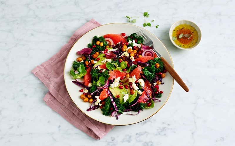 Denne fargerike salaten med grapefrukt, grønnkål og ristede kikerter er god til både lunsj og middag. Grapefruktsaften bruker du som base i en syrlig vinaigrette. Se oppskriften her.