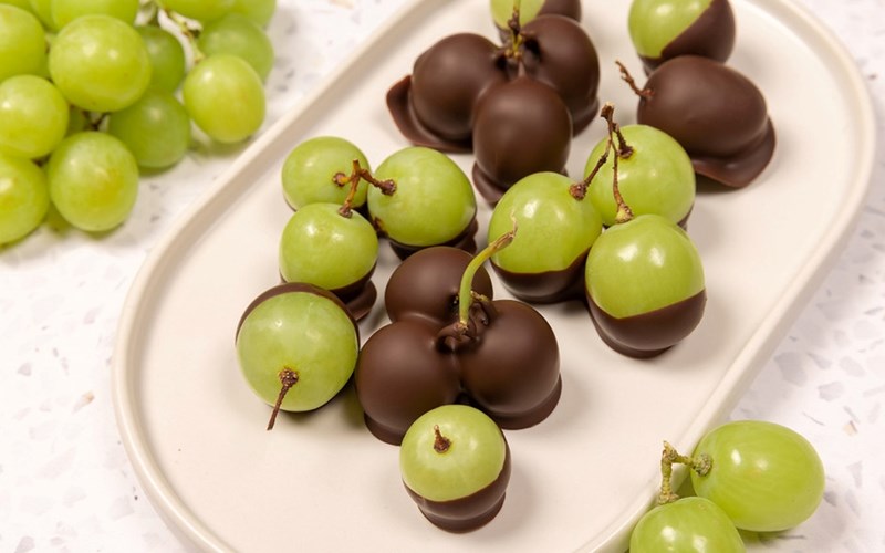 Grønne druer med sjokolade er en enkel og god dessert du kan lage på forhånd. Prøv deg gjerne fram med ulike sjokoladetyper. Her har vi brukt mørk sjokolade.
