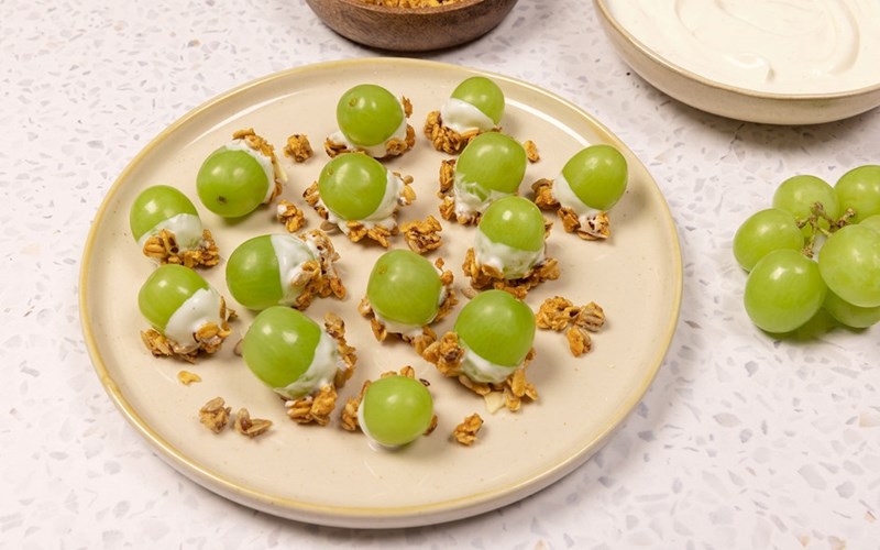 Grønne druer med yoghurt og granola er en frisk og spennende snack som kan nytes både til frokosten eller som et enkelt mellommåltid.
