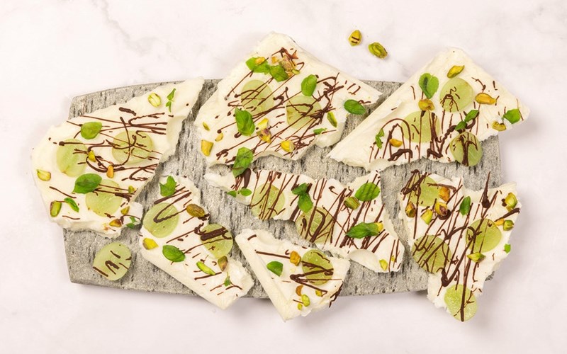 - Tilsett delte grønne druer, hakkede pistasjnøtter og sjokolade. Topp med litt frisk mynte.