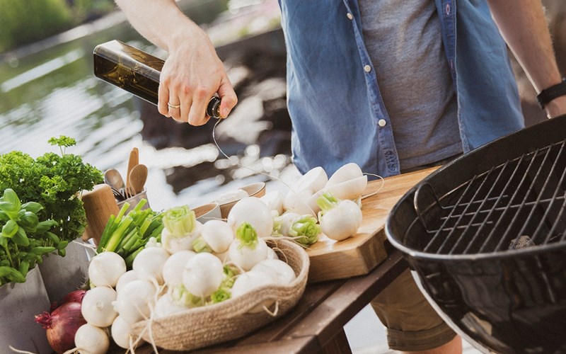 - Ha olje på grønnsakene før de legges på grillen. Bruk en nøytral olje som tåler høy varme. Om du skal grille grønnsaker som trenger kort tid kan du bruke olivenolje – da får du en ekstra intens grillsmak.