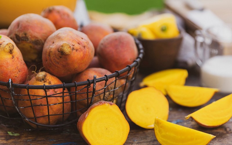 Gule beter er kanskje den mildeste beten vi har, og har en søt og rund smak. På grunn av den milde smaken er det en fin bete for de av oss som synes rødbeter kan bli litt kraftige i smaken. Skallet er oransje, og fruktkjøttet har en herlig, knallgul farge – det blir virkelig en fest på tallerkenen.