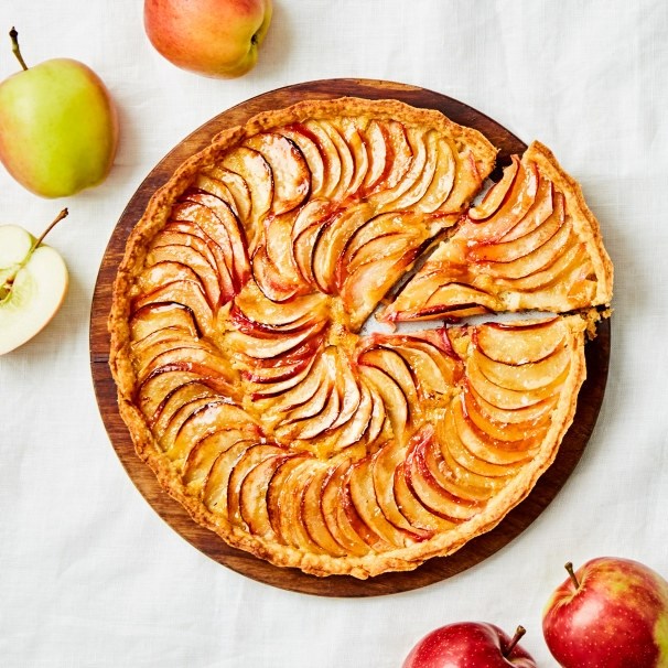 Den ser imponerende ut, men fremgangsmåten enklere enn du tror. Hemmeligheten ligger i å kjevle ut tertedeigen tynt nok og legge epleskivene i et fint mønster. Mandelkremen i bunnen er valgfri men tilfører et ekstra smakselement.