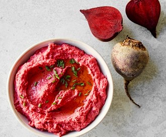 Grønnsakstallerken med syltet rødløk, rødbethummus og urtedressing