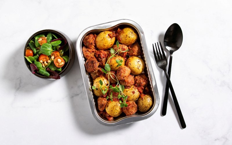 Gjør det enkelt – lag middagen rett i formen. Legg kjøttboller og tomatsaus sammen med potetene og bak i ovnen. Utrolig enkelt og skikkelig godt! Se hele oppskriften her.