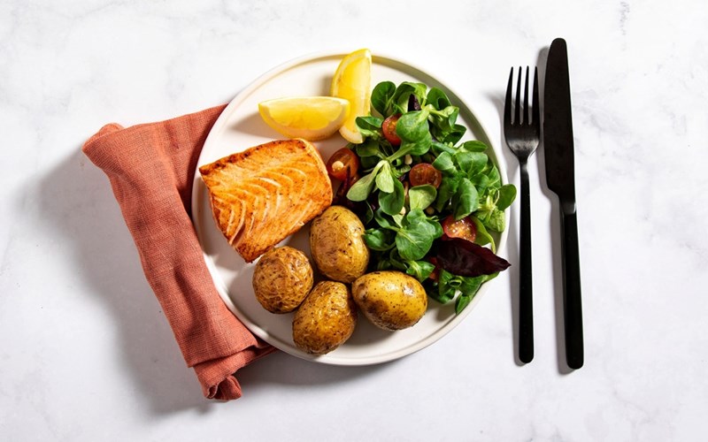 Småpoteter med bakt laks og feldsalat