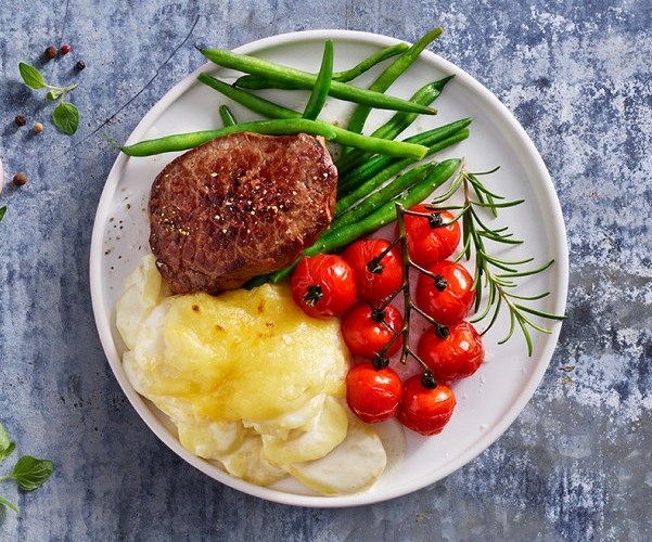 Fløtepoteter med biff, ovnsbakte tomater og aspargesbønner