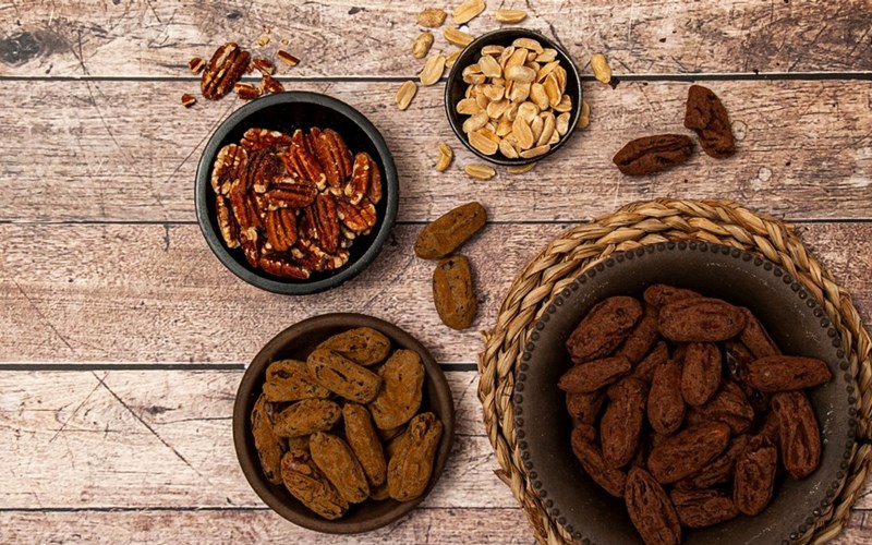 Daddelkuler med nøtter er skikkelig digg når du trenger litt påfyll – det blir ekstra enkelt å de lage når dadlene allerede er smaksatt! Her har vi brukt peanøtter, men kulene blir også gode med Pekannøtter, Chiafrø, Cashewnøtter eller Valnøttkjerner.