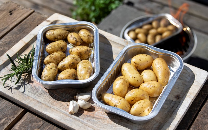 Fjern plastfilmen, sett aluminumsformen på grillen og grill i 12-15 minutter under lokk. Vend potetene underveis.