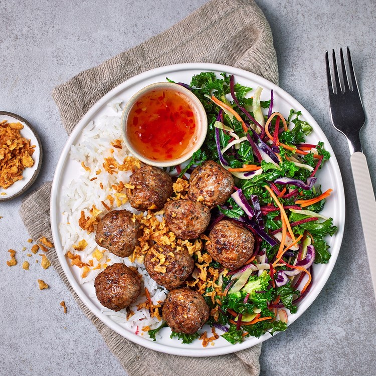 - Fordel ris, Grønnkål Mix og kyllingkjøttboller i passende boller. Dryss over finsnittet chili, sprøstekt løk og frisk koriander. Server gjerne med sweet chili saus til.