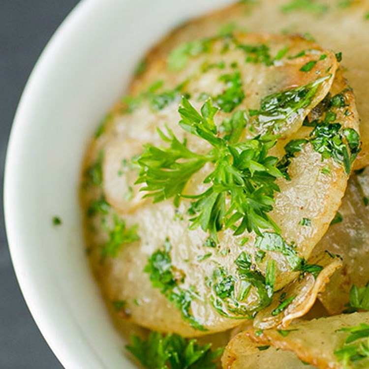 - Bruk en varm stekepanne og stek skivene gylne i smør sammen med litt finsnittet hvitløk
