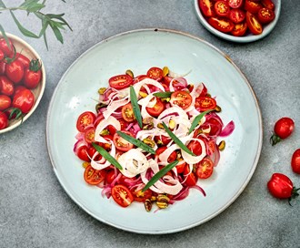 Mini plommetomaten søt og god, og inneholder lite vann – akkurat det du vil ha i en Caprese! Christer Rødseth har i tillegg laget en herlig kikertpuré, som gjør denne tomatsalaten perfekt som en mettende og god lunsj.
